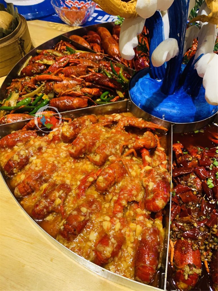 接下来,重头戏就登场了,888元一份的龙虾,姗姗来迟,超大一个圆盘,里面装着6种不同口味的龙虾,中间立着一个巨龙,很有气势。