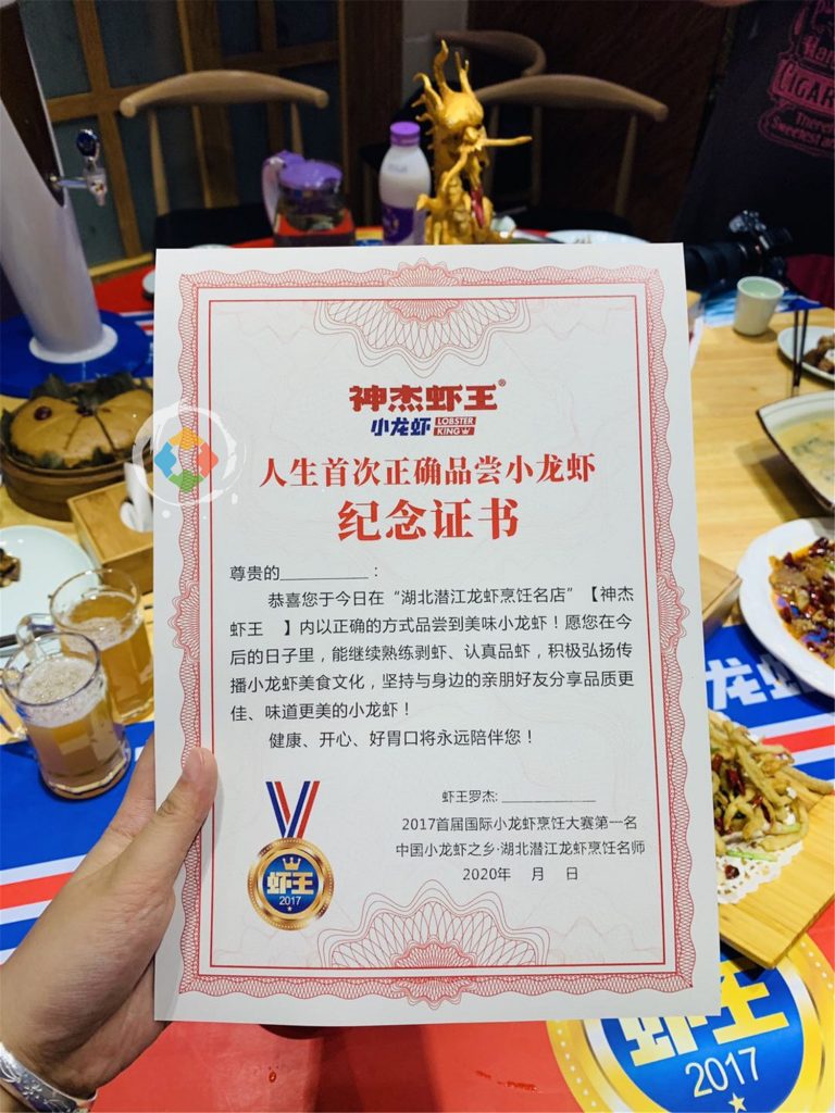 最后走的时候,老板还给我们每个人发了一个证书和奖牌,这个操作就有点迷了,奖牌上还写着“虾王”,真是太搞笑了,放在家里给亲戚朋友吹下牛还是不错的。