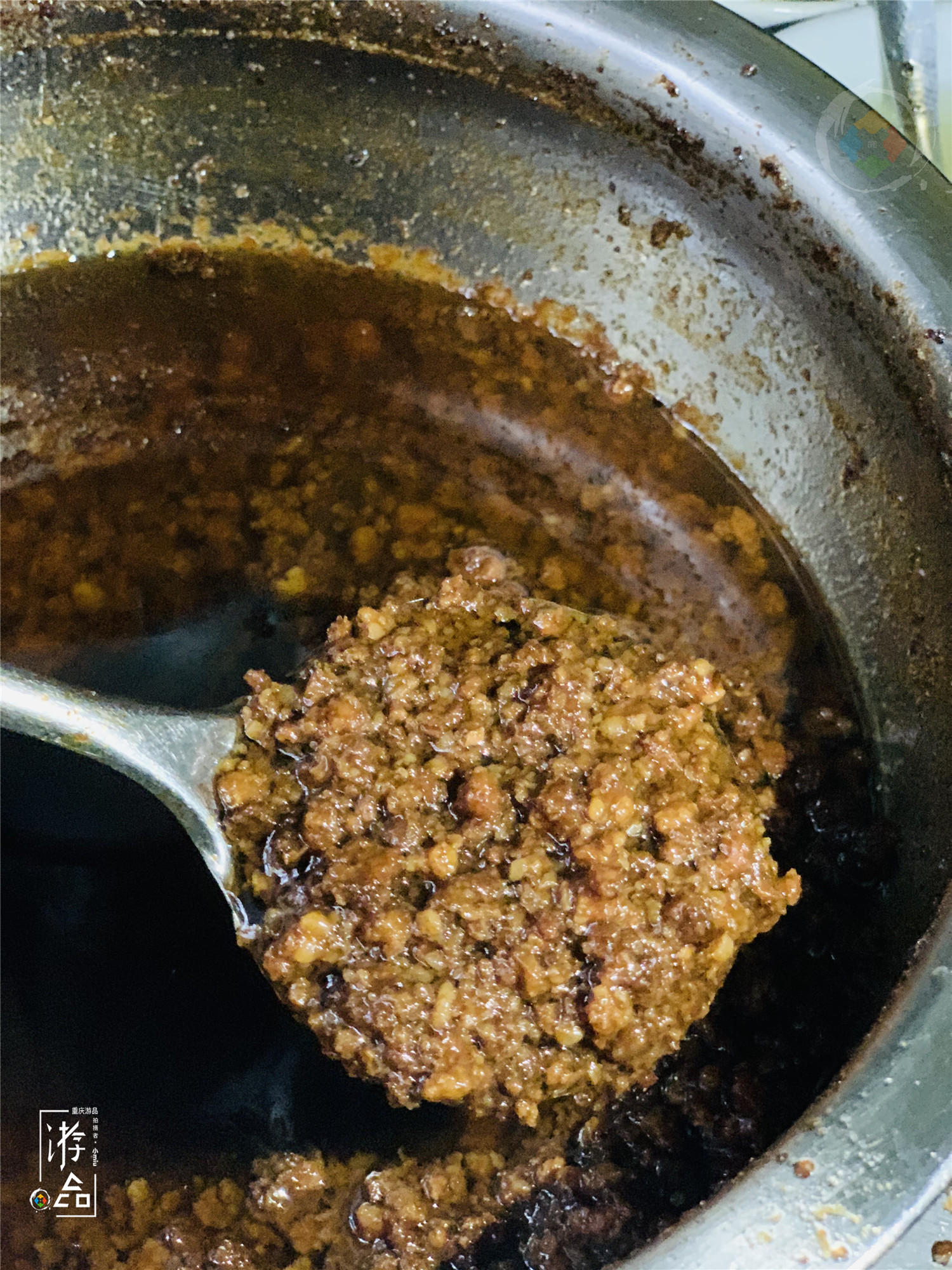 杂酱的品质肉眼可见,肉末大小不一,一看就是手剁的,因为肥瘦相间,吃起来口感更显温润,越嚼越香。