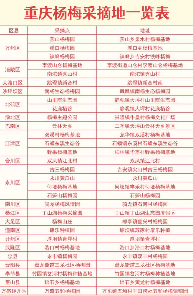 恰逢端午节,重庆地理地图也为大家推出了2021重庆杨梅采摘地图,将重庆市内主要的杨梅种植区域进行了罗列,大家可以就近选择采摘。