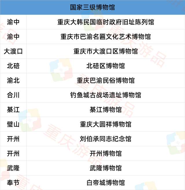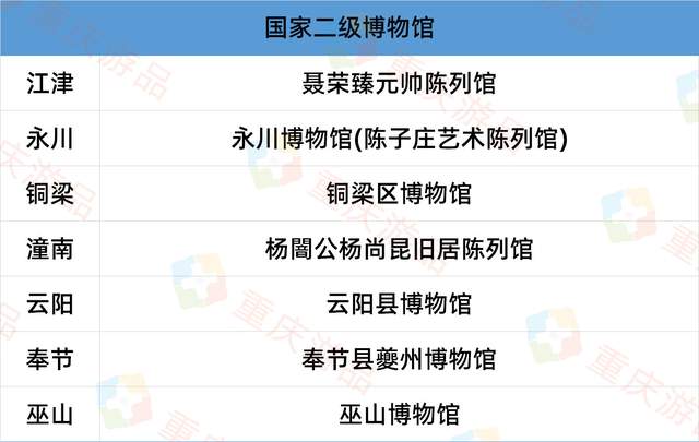 根据统计,重庆全市目前共有24个国家级博物馆,包括5个国家一级博物馆,7个国家二级博物馆,12个国家三级博物馆。具体名单可参加如下表格: