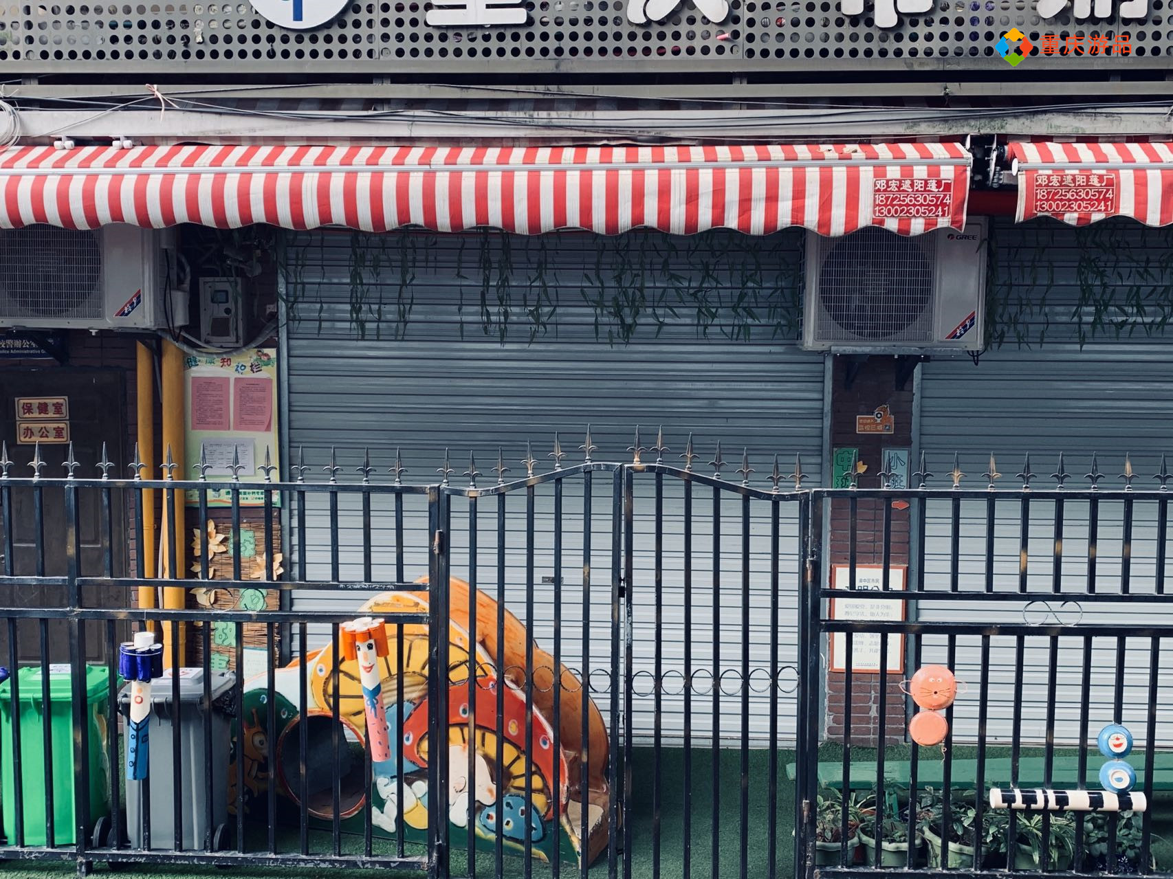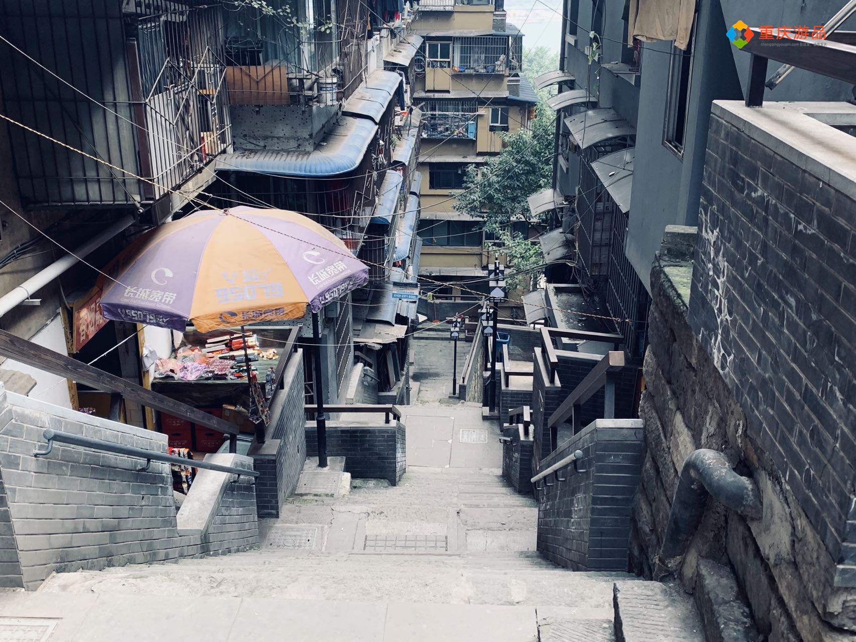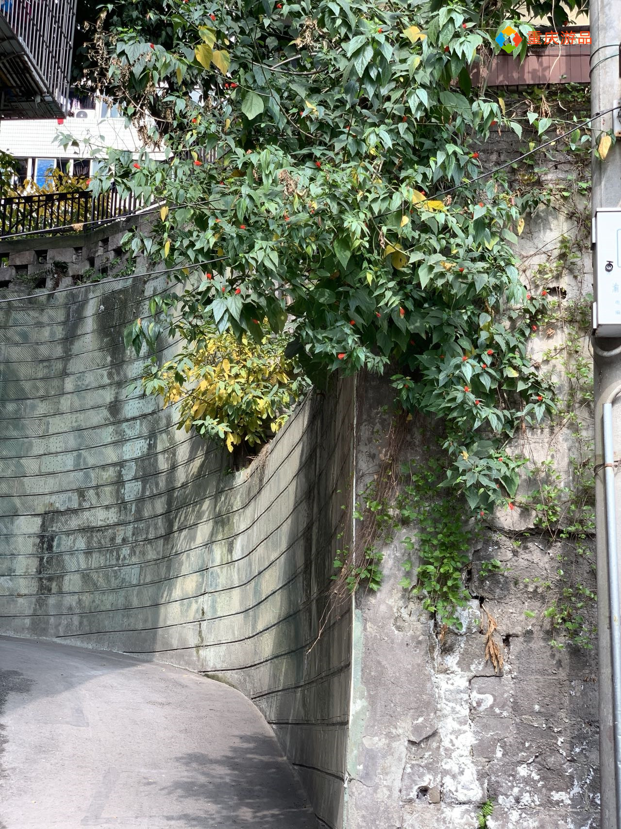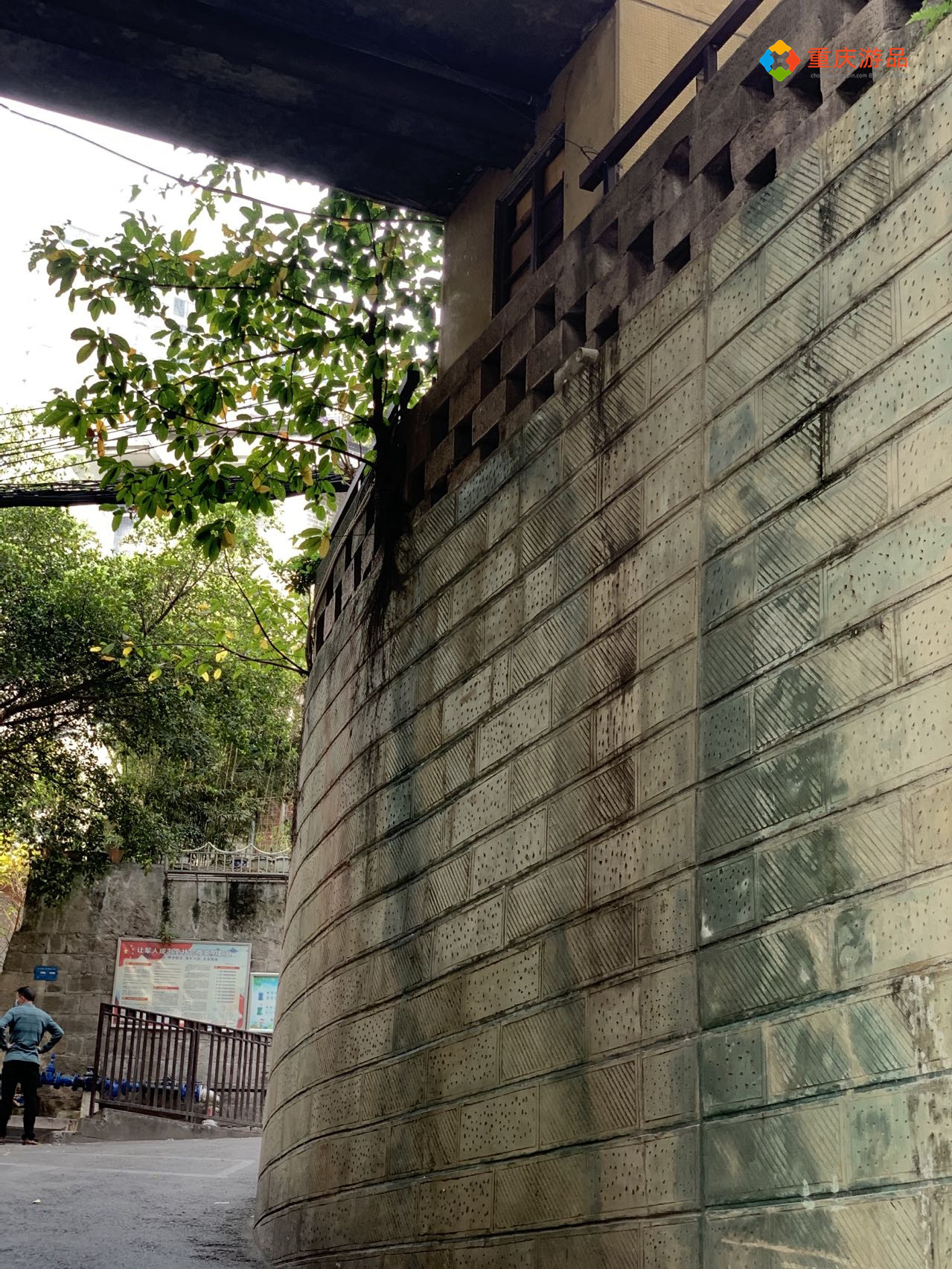 左边有一个斜坡,似乎是这里的网红景点,墙壁上还张贴了一张安全告示,提醒游客拍照打卡时注意安全。斜坡右侧是一整面绿色的围墙,连接着上面那一栋住宅的一楼,真的太魔幻了,不愧是重庆。