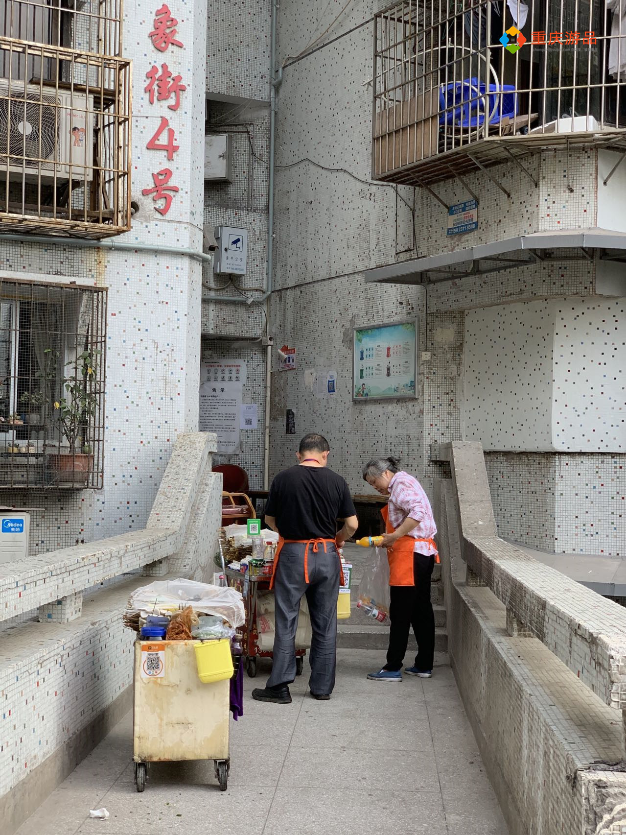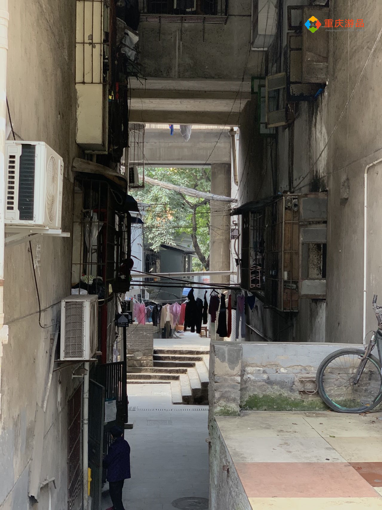 从15楼向下走,就来到了中间层的平台,这里像是一个跑道,两边停放着一些车辆,还有垃圾回收的地方,也许是因为面朝长江,这里没有楼道里那么阴暗。
